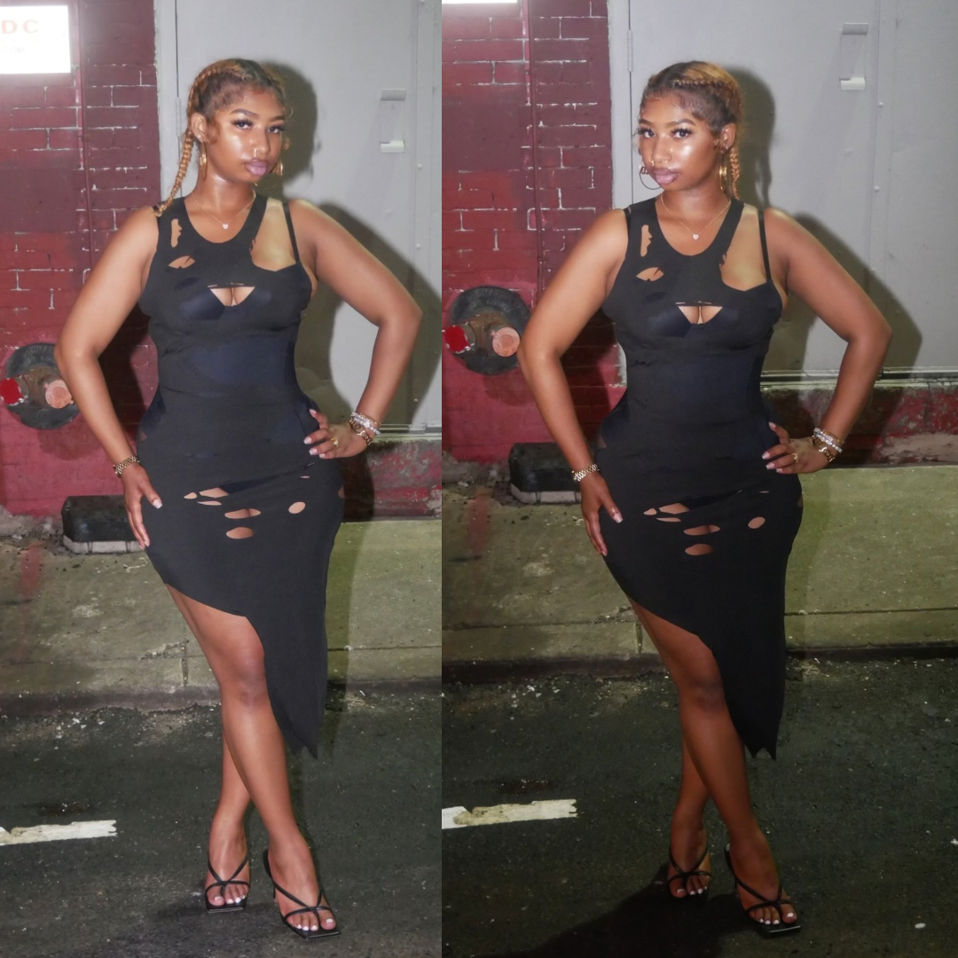 • Bodycon Fitted Dress • Cut Out Rips Throughout Dress • Ribbed Material 5% Spandex • High Stretch Level  • Model wearing Size (L)